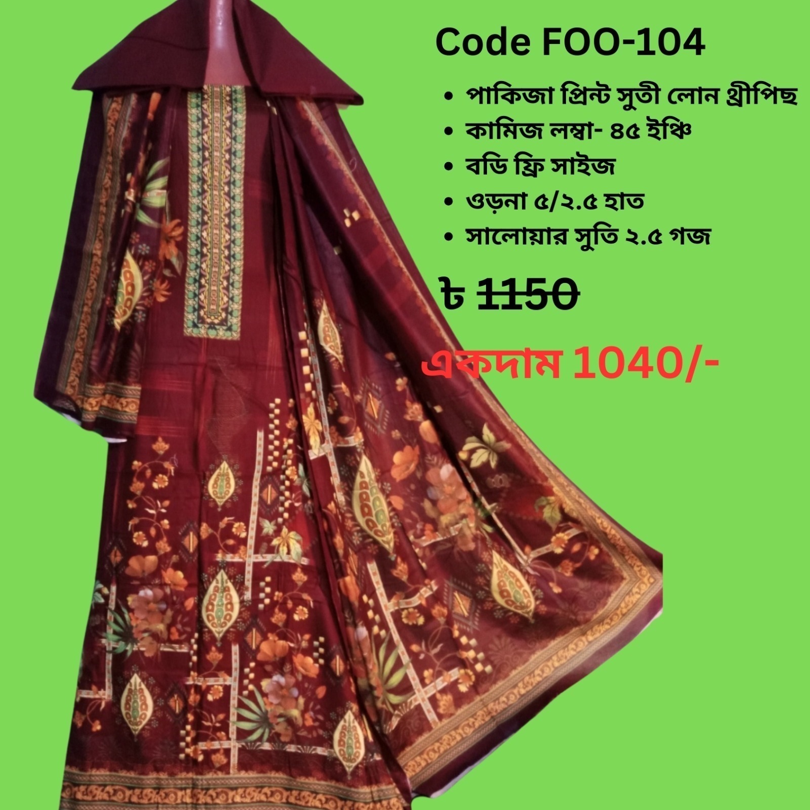 • পাকিজা প্রিন্ট সুতী লোন থ্রীপিস